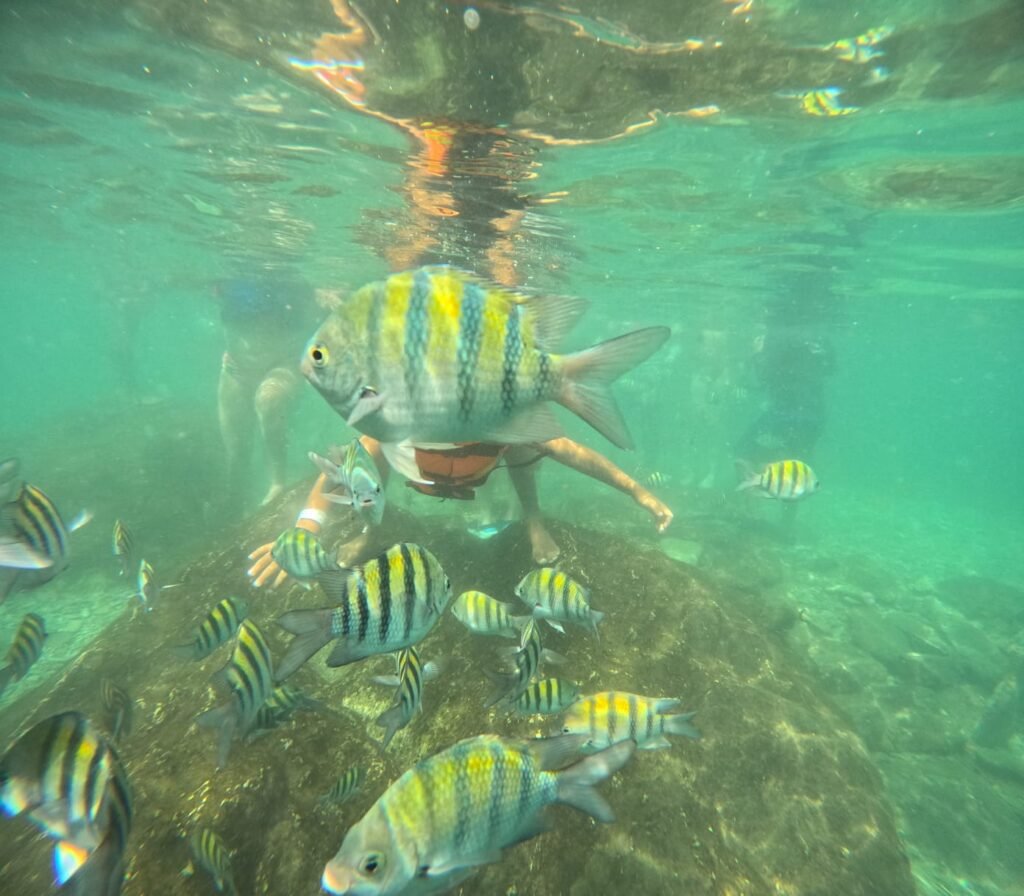 Depuis Taganga, nous avons pris un bateau pour nous éloigner un peu de la côte et plonger près de Plage Grande. On nous a fourni de la nourriture pour nourrir les poissons, ce qui a attiré de nombreuses espèces colorées autour de nous. C’était incroyable de voir de près la biodiversité marine de Santa Marta. Les organisateurs de l’excursion ont rendu ce moment encore plus spécial en prenant des photos numériques de chacun, qu’ils nous ont ensuite remises comme souvenir de cette expérience unique.